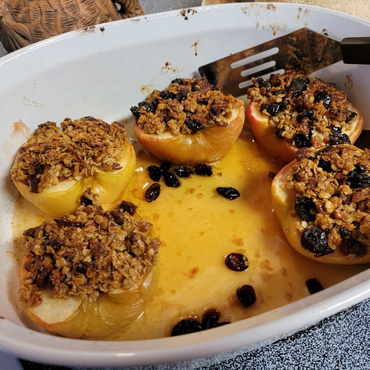 - Place apples in a baking pan and fill with the oatmeal mixture.