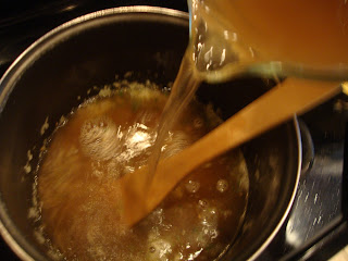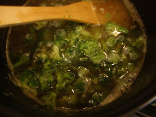 Cook for another minute or two, just so the flavors start to combine. Then add about 6 cups of your beef stock and your broccoli.