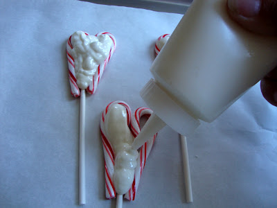 Unwrap and place candy canes on a wax paper lined cookie sheet in the shape of a heart. Place a lollipop stick down the center, making sure it’s at least 1/2 inch inside of the heart.