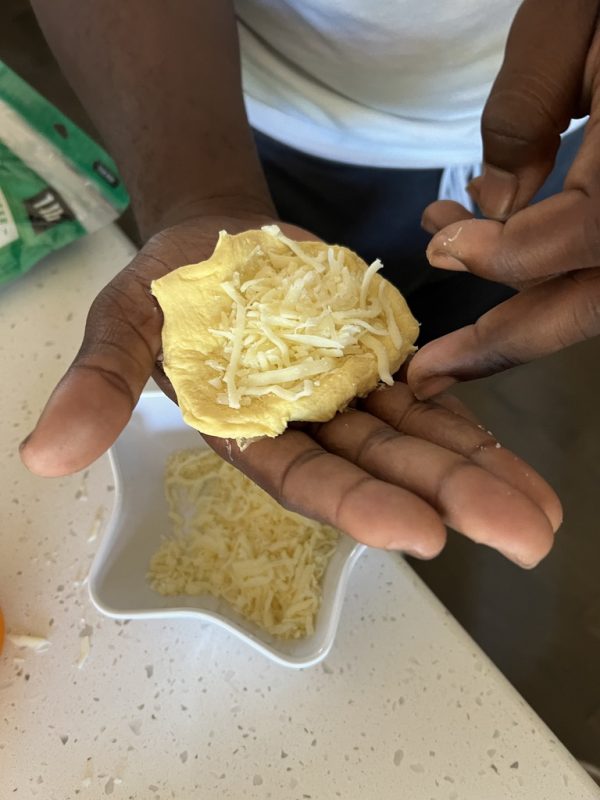Flatten the biscuit dough with your hand and spoon about a tbsp worth of cheese into the center of the dough. Fold the dough in half, then pinch the side together tightly. The dough should resemble a dumpling like you’d get from your favorite Chinese restaurant.