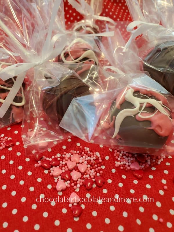 I was thinking about ways to wrap them so that I could give some to friends and I came up with cake pop covers at the store. They are the perfect size and even have cute ribbons with them for decoration.