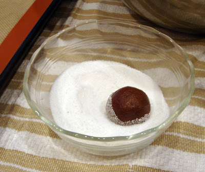 Roll dough into 1 inch balls and then roll balls in granulated sugar.