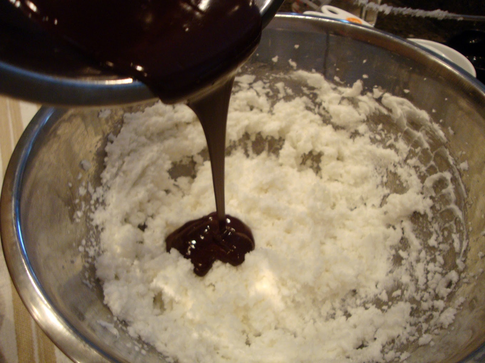 Add cooled chocolate, eggs, corn syrup and flavorings. Mix well.