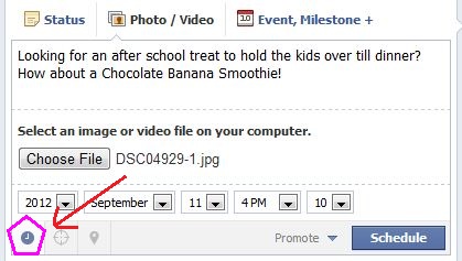 Here it is! I know that at 4:20pm on Tuesday, I’ll be busy with the kids after school. But anyone looking for snack ideas will see my Chocolate Banana Smoothie pop up on their wall. Then Tuesday night after everyone’s in bed, I can pop on facebook and respond to any comments.