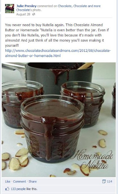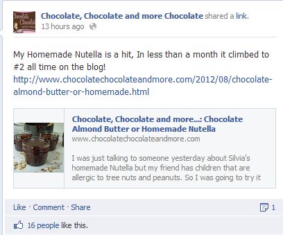 Hopefully you’re reading my tips and finding a few things you can do to make facebook work for you. I wrote about setting up your page and sharing your photos here. Before we move on to Sharing, I just want to restate when you share your posts-SHARE A PHOTO! I did a test, just to verify what I already knew. I shared a link of my Homemade Nutella-just the link with a nice little comment.