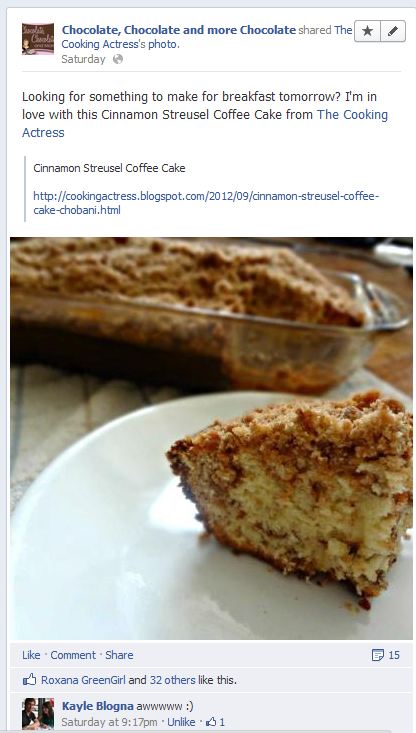 In your comments tag the page you got it from (to tag on facebook, use the @ sign then with no spaces type in the page name, @the cooking actress) say something nice and hit the share button. Also when I share I leave a comment on the original post “this is so yummy I just have to share” or something like that. I honestly love this Cinnamon Streusel Coffee Cake from the Cooking Actress so I’m pretty sure my readers will too. And Kayla put the link to her post in her comments so my readers can either go to her facebook page (because I tagged her) or go straight to the coffee cake post. Win, win.