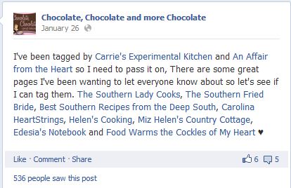 So now that I’ve convinced you to share photos, it’s time to talk about sharing. Not your posts but other stuff. The cute picture of a puppy, the funny saying, another page’s post. Reminder, this is what works for me, so don’t shoot me. Take the position of your reader. Why did they come to like your page in the first place? Probably because of the delicious food you post. (or whatever your blog is about) After liking a zillion other pages to make sure they’d come “like” me back, I now had a wall full of posts. I love when my food friends share more food. It’s how I get ideas, find more friends and when I go visit, I know that we have something in common. Sharing things on your page just to fill space will annoy your readers. Sharing things on your page that have no relevance to what your page is about will annoy your readers. I’m a food blog, so if I start sharing photos about dinosaurs, I’m going to annoy my readers, and after a while they will probably start to “unlike” me.