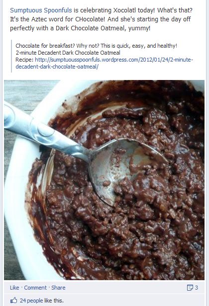 Facebook Parties can be huge for both the host and the attendees. But they are a ton of work for the host. Sumptuous Spoonfuls Did an A-Z challenge about a month ago. Each Day she would take the letter of the day, choose an ingredient, give the health benefits of it then invite everyone to share their appropriate photos and links on her page. She then shared them with all her readers. Any time I was able to participate, my likes would go nuts. I’ll never be able to pay Ann back for all the good she brought to me but any time I can share something of hers, that I know my readers will like, I try to. I loved this Chocolate Oatmeal she posted for Xocolatl (Chocolate.) Ann’s starting a new party series on Facebook. Fit and Fun Fridays. I can’t wait to see everything that gets shared from that party!