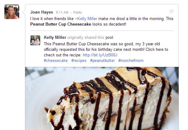 That Chocolate Cake caught my attention and here are 2 people that think that cake is awesome too. Click on the names, check them out. They may be people you want to add to your circles, they may not. You know what? I left a comment on the post though. Who knows, even if I don’t want to follow them, they obviously like chocolate cake, maybe they’ll want to follow me.