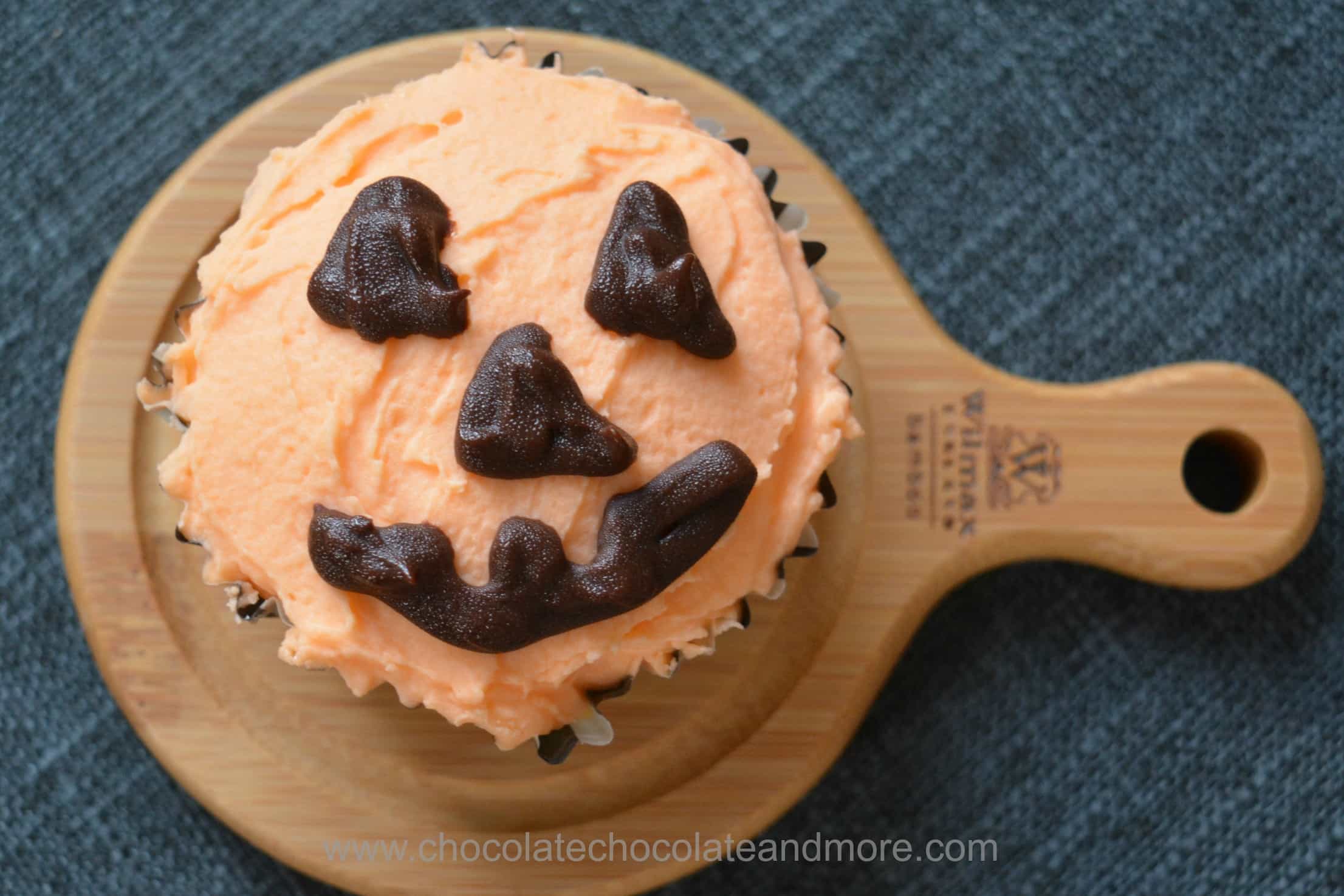 I’m going to a Halloween party in just a few hours so I topped mine with orange buttercream and made pumpkin faces with a little chocolate ganache. I need to improve my technique but our jack-o-lanterns were never perfect either.